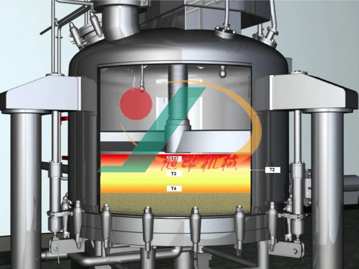 (4) 洗滌:在容器內(nèi)側(cè)裝有萬(wàn)向清洗球,使清洗液均勻分布于容器內(nèi),用以進(jìn)行物料清洗及容器清洗,通過升降攪拌漿葉的攪拌將濾餅和清洗液混合,使?jié){狀懸濁液濾餅充分洗滌;